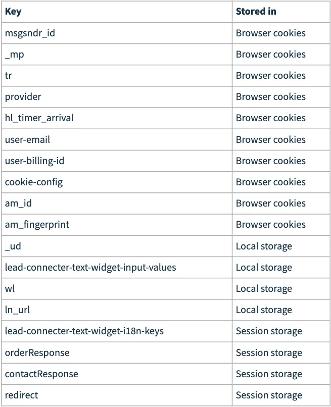The table list below lists all of the essential cookies with variable names for funnels/websites functionalities to work properly.